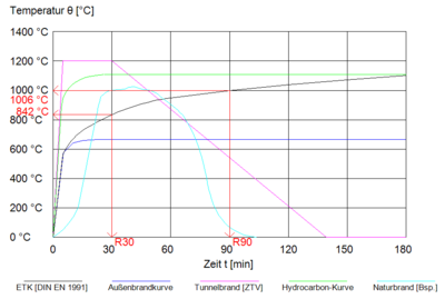 - Nach 30 Minuten beträgt die Temperatur in diesem standardisierten Brandmodell etwa 842 °C, nach 90 Minuten ca. 1006°C und nach 180 Minuten etwa 1110°C.[9] Die funktionellen Anforderungen und Leistungsniveaus für Bauteile werden in der Regel mit Bezug zur ETK festgelegt.[6] In der Regel ist für brandschutztechnische Nachweise von Tragwerken im Hochbau die ETK anzuwenden.