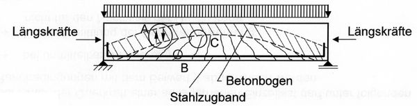 Ein bedeutender Tragmechanismus für Bauteile ohne rechnerisch erforderliche Querkraftbewehrung ist die Kombination aus dem Bogen-Zugband-Modell und dem Kamm- bzw. Zahnmodell. Bei Belastung durch eine Einzellast bildet sich ein Sprengwerk, bei Flächenlasten ein parabelförmiger Druckbogen aus. Dieser erzeugt Horizontalkräfte an den Auflagern, die über die Längsbewehrung als Zugband aufgenommen werden. Unterhalb des Druckbogens werden weitere Tragmechanismen aktiviert, die durch das Zahnmodell beschrieben werden. Es entstehen sogenannte Betonzähne, die durch idealisierte Biegeschubrisse begrenzt sind und kontinuierlich mit der Betondruckzone (Druckbogen) verbunden bleiben. Dadurch besteht eine ständige Verbindung zwischen Druck- und Zuggurt, über die die Zugkräfte aus der Bewehrung abgebaut werden können. [1]
