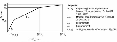 Die Momenten-Krümmungs-Beziehungen lassen sich vereinfachend durch einen trilinearen Verlauf darstellen [1]. Die kennzeichnenden Punkte sind dabei das Rissmoment, das Biegemoment bei Erreichen der Fließgrenze und das Bruchmoment. Für jeden Querschnitt mit abweichender Geometrie oder Bewehrungsmenge sind eigene Momenten-Krümmungs-Beziehungen zu berechnen.